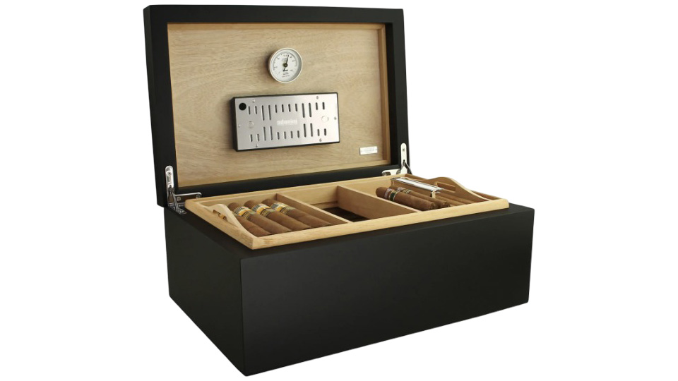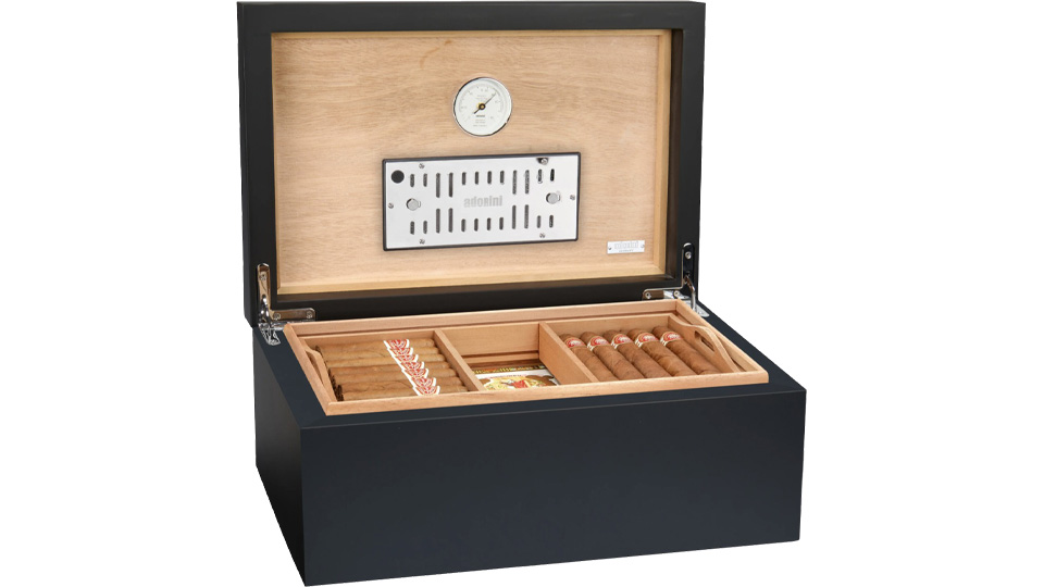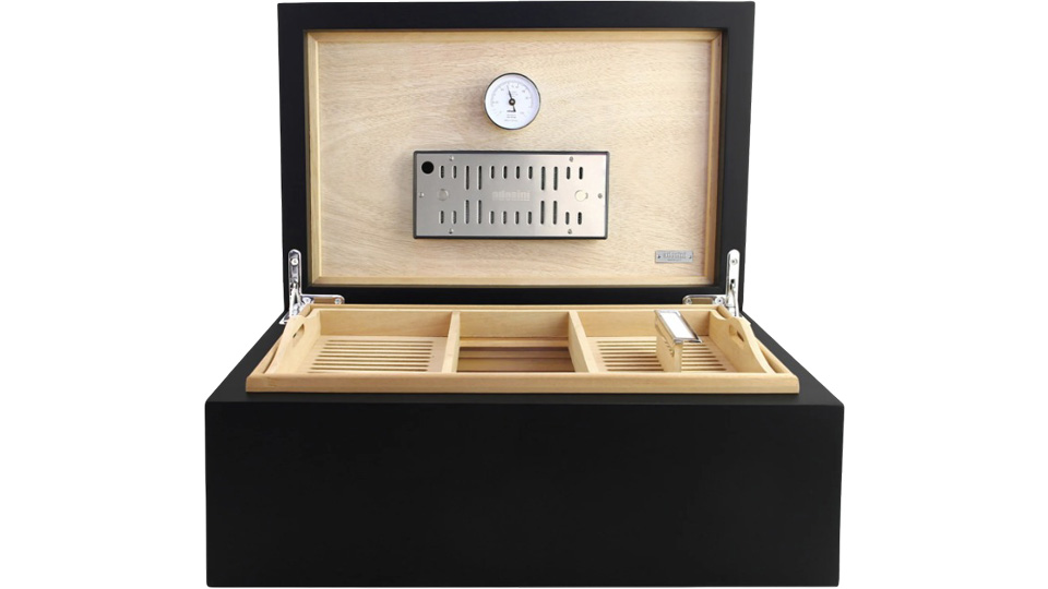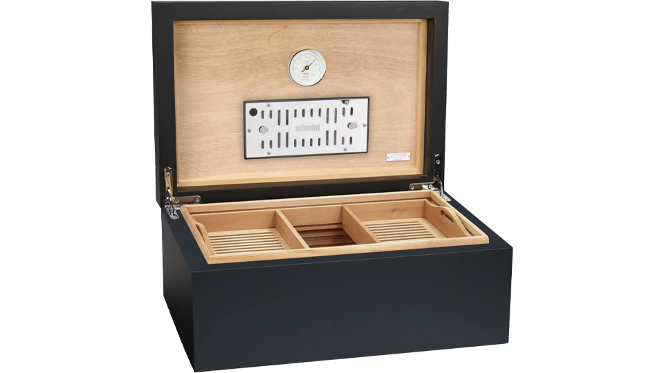 Οι νευρώσεις αερισμού ισπανικού κέδρου RibTech και ένα προ-βαθμονομημένο υγρόμετρο ακριβείας λειτουργούν σε συνδυασμό με το επιχρυσωμένο πολυτελές υγραντικό στοιχείο του Αdorini για να διατηρούν κάθε πούρο σας σε άψογη κατάσταση. Ο υγραντήρας χρησιμοποιεί αντιβακτηριδιακό ακρυλικό πολυμερές fleece για να παρέχει εξαιρετικά συνεπή, αυτορυθμιζόμενο έλεγχο υγρασίας. Η υγρασία μπορεί να ρυθμιστεί χειροκίνητα, ρυθμίζοντας τα ανοίγματα εξαερισμού στον υγραντήρα.