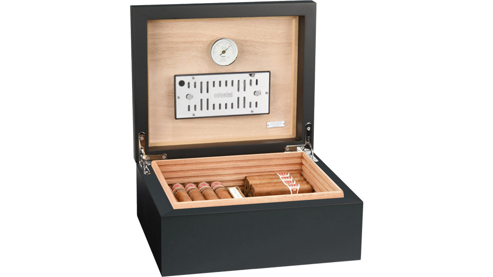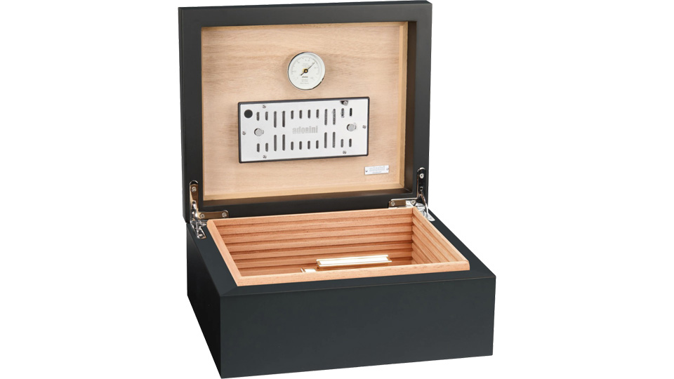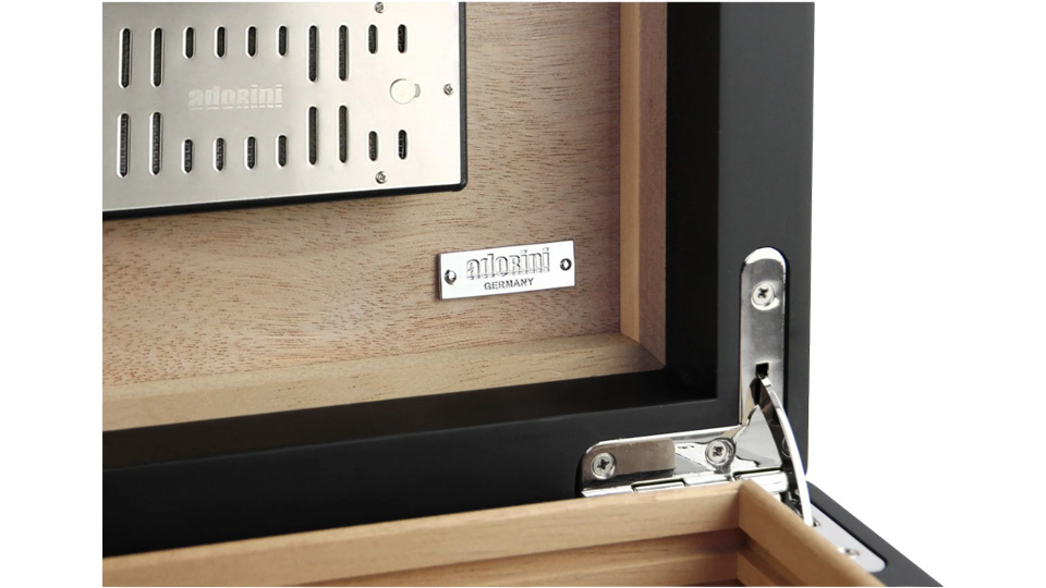 Οι νευρώσεις αερισμού ισπανικού κέδρου RibTech και ένα προ-βαθμονομημένο υγρόμετρο ακριβείας λειτουργούν σε συνδυασμό με το επιχρυσωμένο πολυτελές υγραντικό στοιχείο του Αdorini για να διατηρούν κάθε πούρο σας σε άψογη κατάσταση. Ο υγραντήρας χρησιμοποιεί αντιβακτηριδιακό ακρυλικό πολυμερές fleece για να παρέχει εξαιρετικά συνεπή, αυτορυθμιζόμενο έλεγχο υγρασίας. Η υγρασία μπορεί να ρυθμιστεί χειροκίνητα, ρυθμίζοντας τα ανοίγματα εξαερισμού στον υγραντήρα.