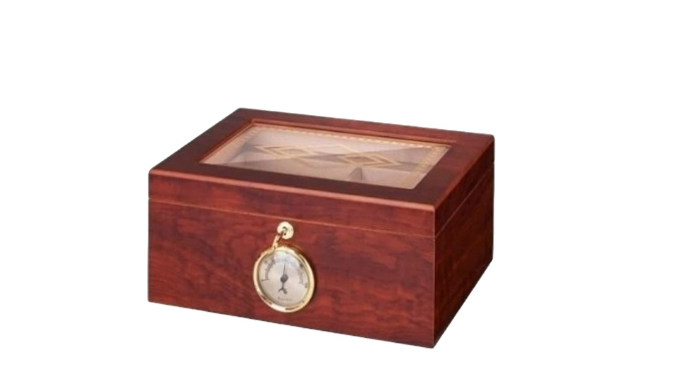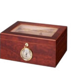 Υγραντήρας για 100 πούρα κατασκευασμένος από τον Angelo με τζάμι στο καπάκι ώστε να βλέπετε τα πούρα σας χωρίς να χρειαστεί να ανοίξετε τον υγραντήρα και εσωτερικό υλικό MDF με επένδυση κέδρου. Διαθέτει εξωτερικό υγρόμετρο και κλειδαριά.