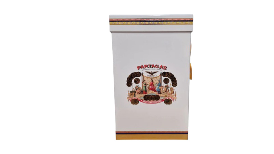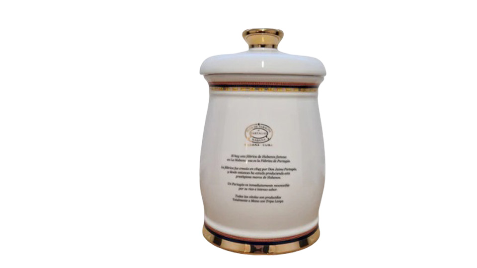 Bάζο από πορσελάνη σχεδιασμένο με το ίδιο σχήμα με ένα πούρο Habanos και χωρητικότητα μεταξύ 20 και 25 πούρων σε κόκκινο και λευκό με χρυσές λεπτομέρειες και το λογότυπο της Partagas.