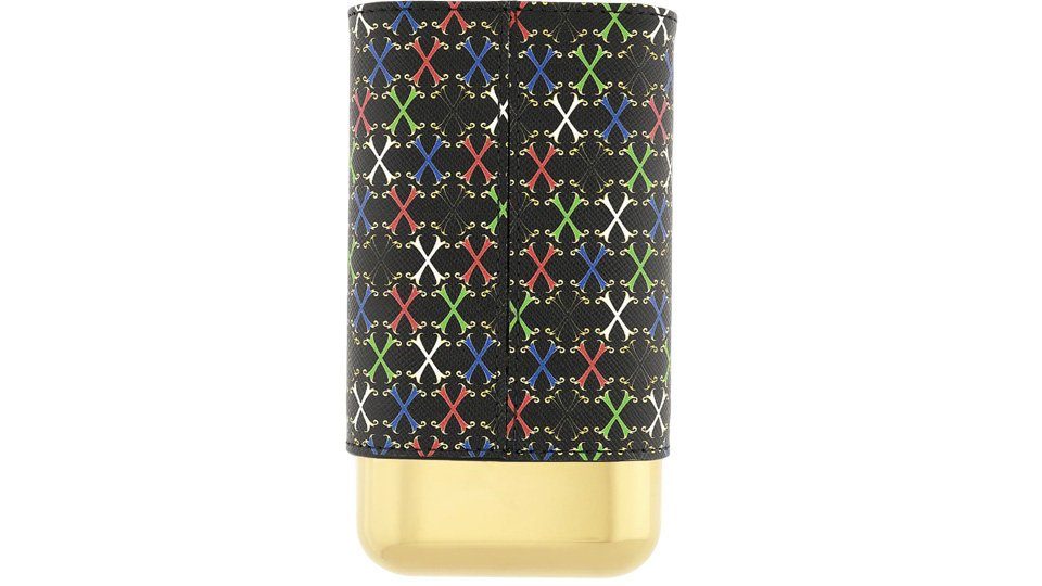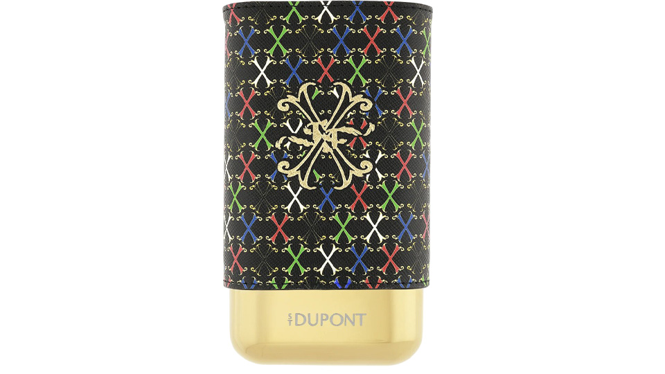 Θήκη για 3 πούρα από επικαλυμμένο καμβά, ανάγλυφο με το πολύχρωμο μονόγραμμα X, σε συνδυασμό με δέρμα μοσχαριού. Ανάγλυφο λογότυπο Opus X Fuente σε χρυσό επάνω στη θήκη. Χρυσή βάση με χαραγμένο το λογότυπο S.T. Dupont στο μπροστινό μέρος.