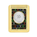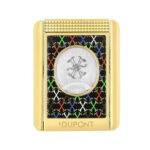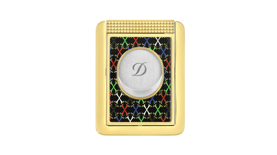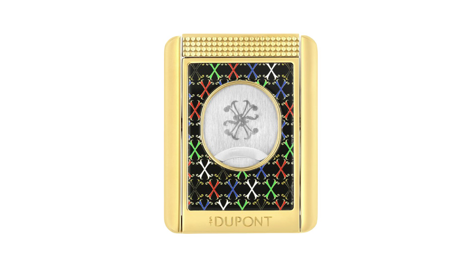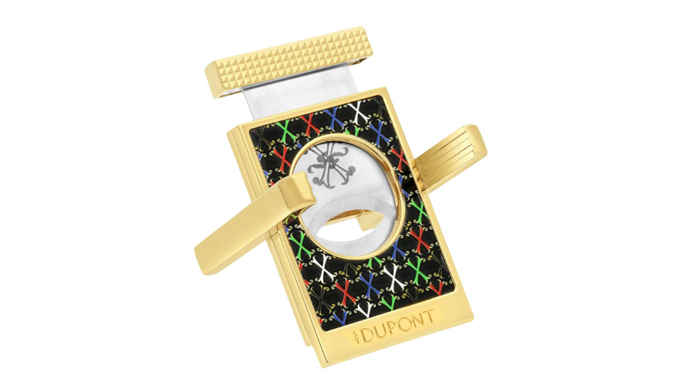Cigar Cutter Stand – Μαύρη γυαλιστερή λάκα, διακοσμημένη με το πολύχρωμο μονόγραμμα X και το έμβλημα Opus X Fuente χαραγμένα στη μπροστινή λεπίδα, με το εμβληματικό γράμμα “D” χαραγμένο στην πίσω λεπίδα. Γκιγιόσε σε μοτίβο διαμαντιού με χρυσό φινίρισμα.