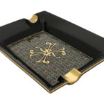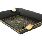 Σταχτοδοχείο από μαύρη λάκα, διακοσμημένο με το πολύχρωμο μονόγραμμα X και το έμβλημα Opus X Fuente στο κέντρο. Χειροποίητες χρυσές λεπτομέρειες, ζωγραφισμένες στο χέρι, στις αυλακώσεις.