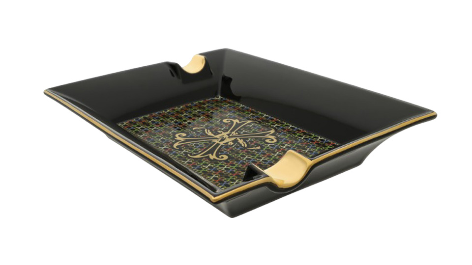 Σταχτοδοχείο από μαύρη λάκα, διακοσμημένο με το πολύχρωμο μονόγραμμα X και το έμβλημα Opus X Fuente στο κέντρο. Χειροποίητες χρυσές λεπτομέρειες, ζωγραφισμένες στο χέρι, στις αυλακώσεις.
