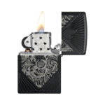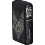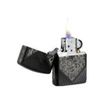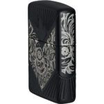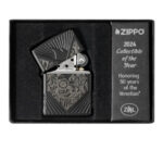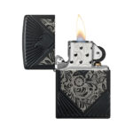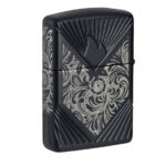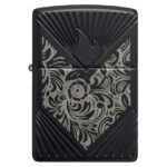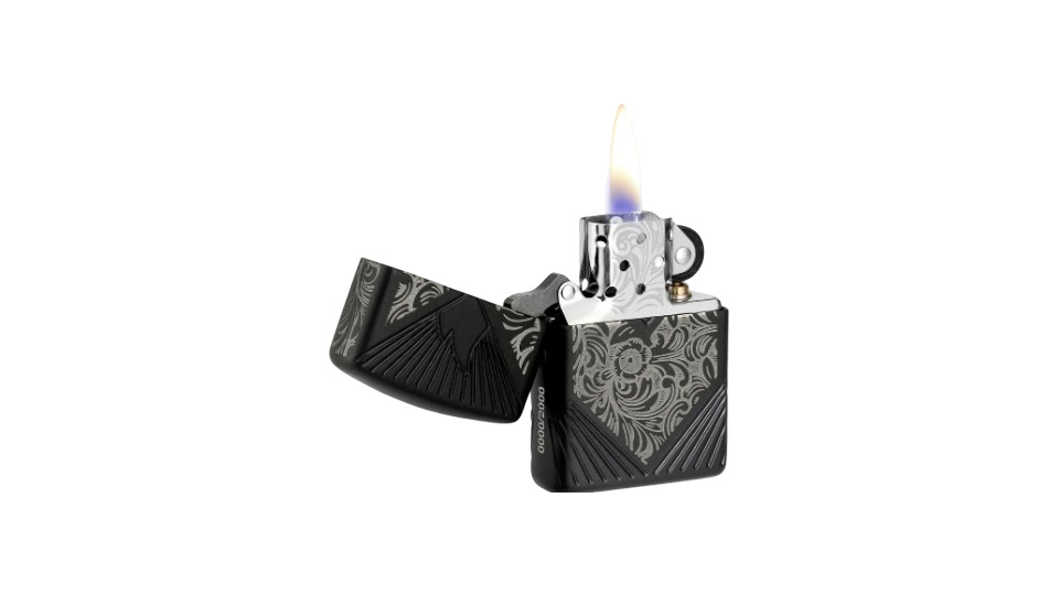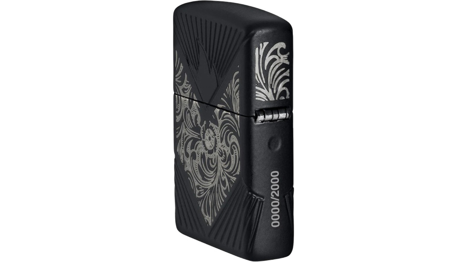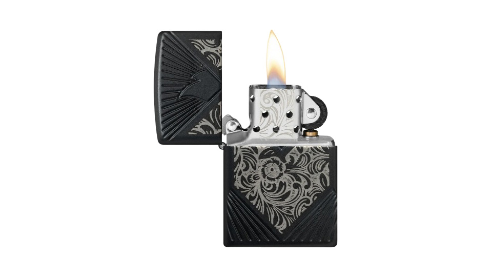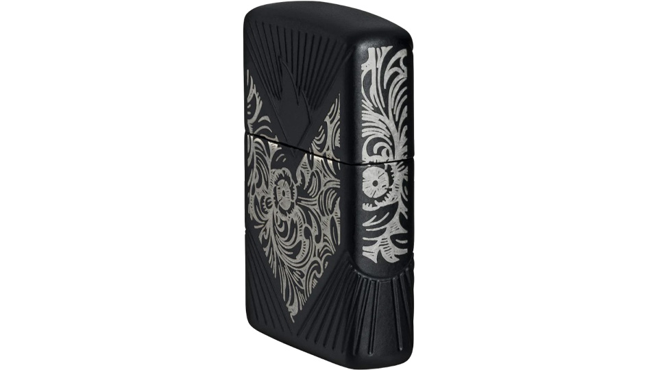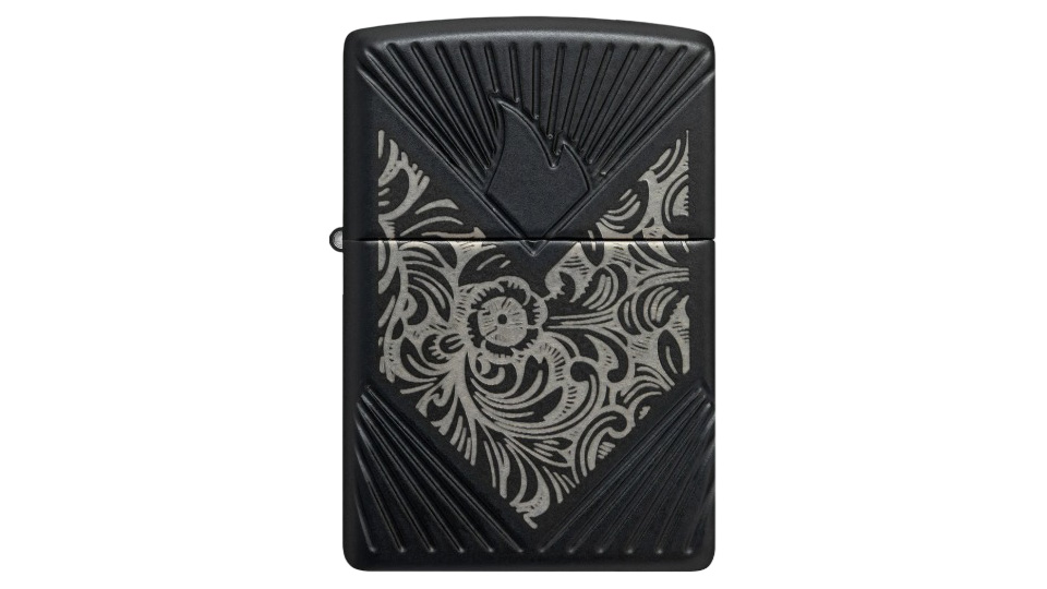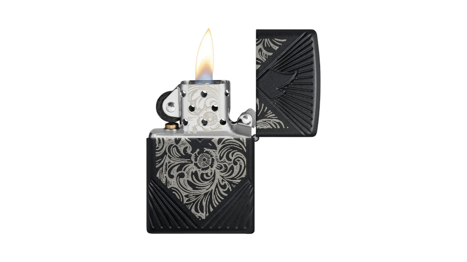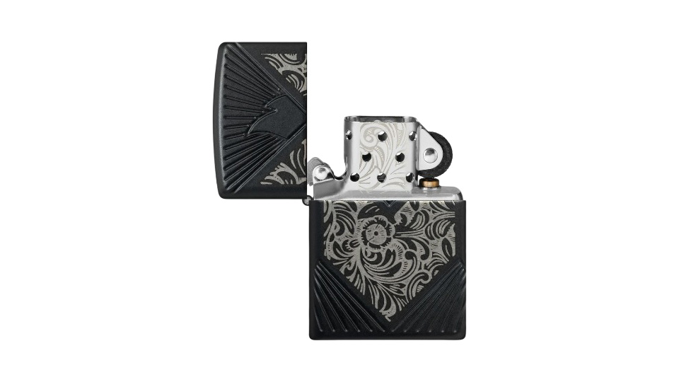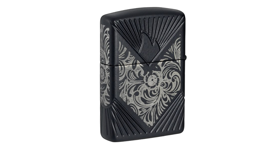 Το εμβληματικό μοτίβο Venetian® που παρουσιάστηκε ως Florentine το 1974, στροβιλίζεται σε όλες τις πλευρές της θήκης Armor® με τη διαδικασία Laser Engrave. Ο περίτεχνος σχεδιασμός έρχεται σε όμορφη αντίθεση με το Black Matte φινίρισμα, το οποίο έκανε το ντεμπούτο του το 1984, ενώ το εικονίδιο Zippo βρίσκεται ανάμεσα σε διαγώνιες ρίγες MultiCut σε μια ωδή στο πρώτο σχέδιο Deep Carve που αποκαλύφθηκε το 2004. Τέλος, το βενετσιάνικο μοτίβο αντιγράφεται με λεπτή χάραξη με λέιζερ στο ένθετο χρωμίου, το οποίο επιλέχθηκε ειδικά για την Ευρώπη, τη Μέση Ανατολή και την Αφρική.